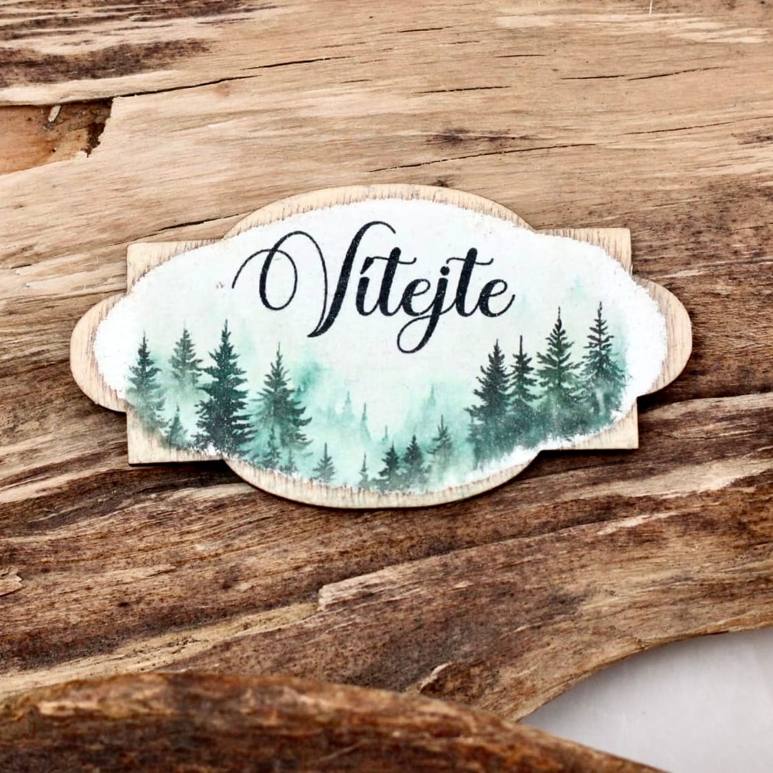 Dřevěná cedulka „Vítejte“ s jemným motivem lesa v mlžných zelených tónech. Skvěle se hodí do přírodních dekorací a věnců .