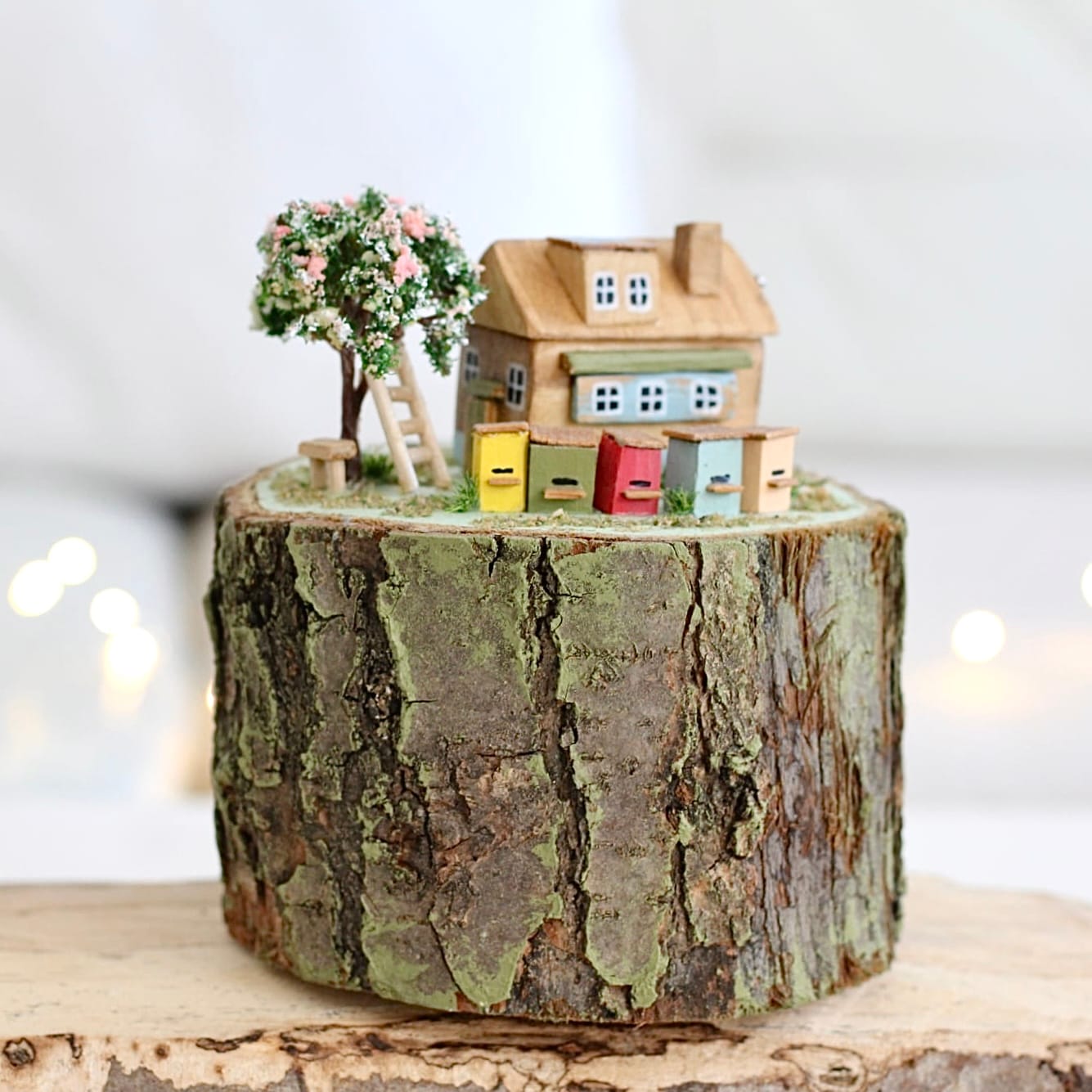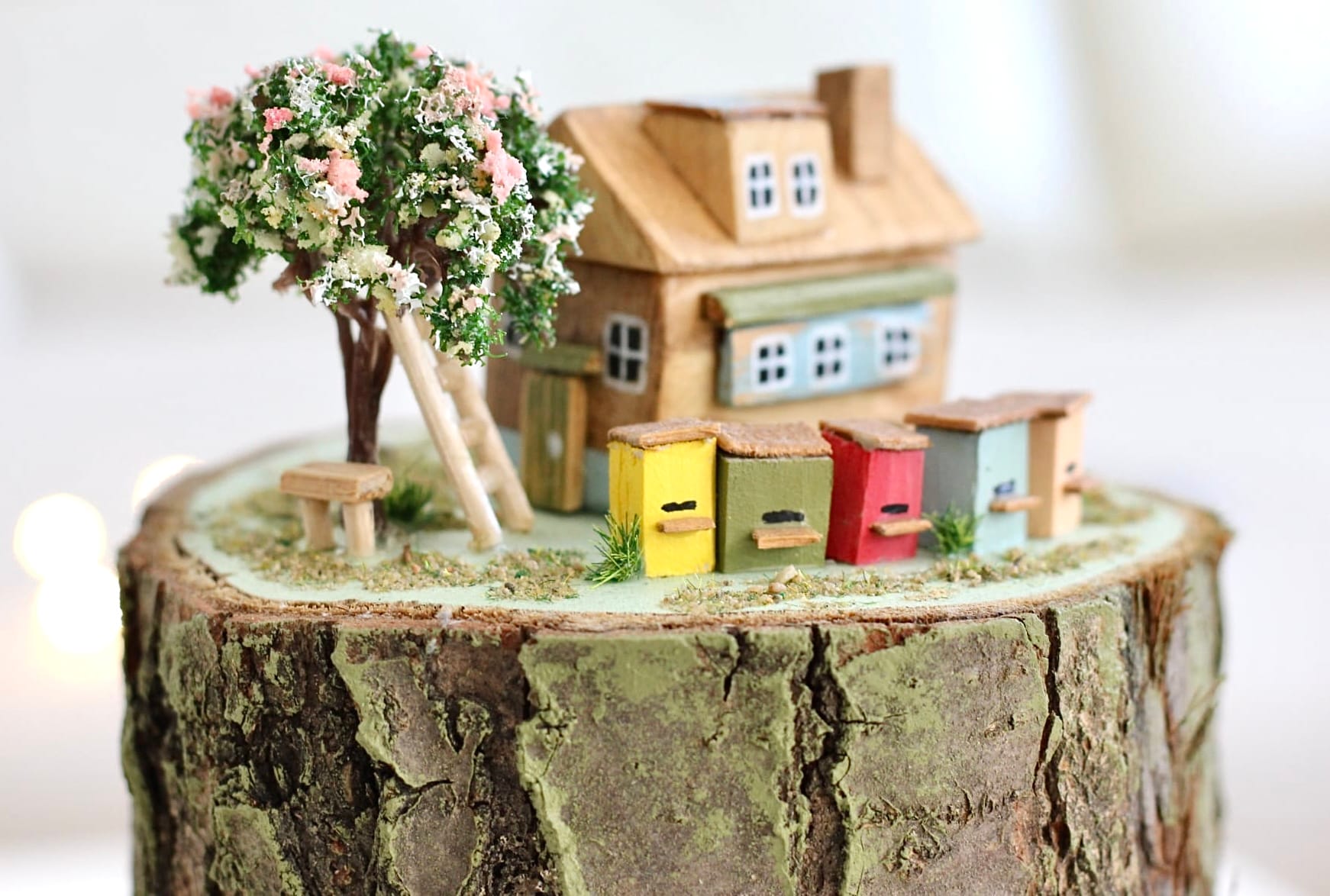 Detailně propracovaná scéna s kvetoucím stromem, žebříkem a barevnými úlky vytváří útulnou atmosféru a přináší kousek přírody přímo do vašeho interiéru.
