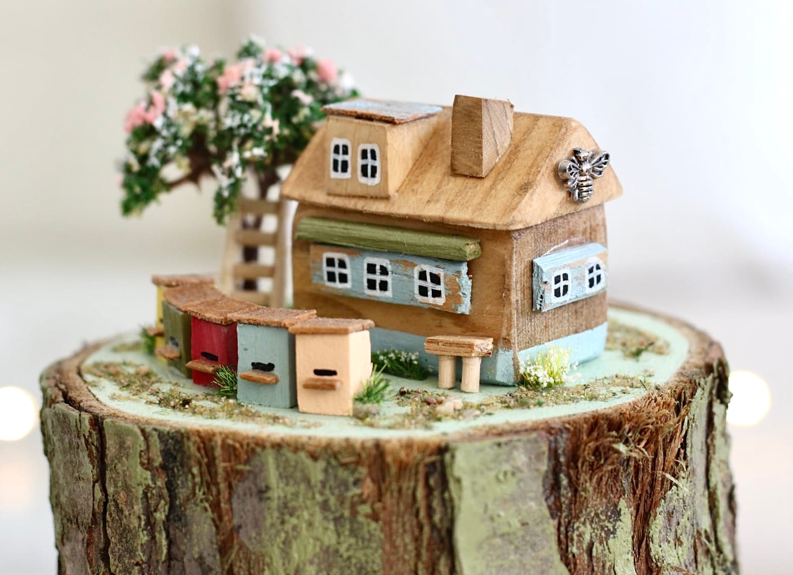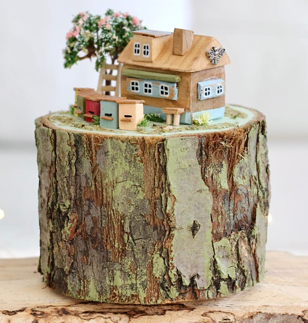 Ručně vyráběná dekorace z přírodního dřeva v podobě roztomilé miniatury venkovského domečku.