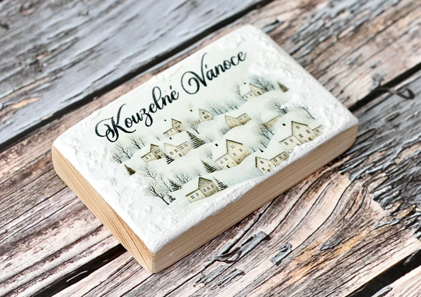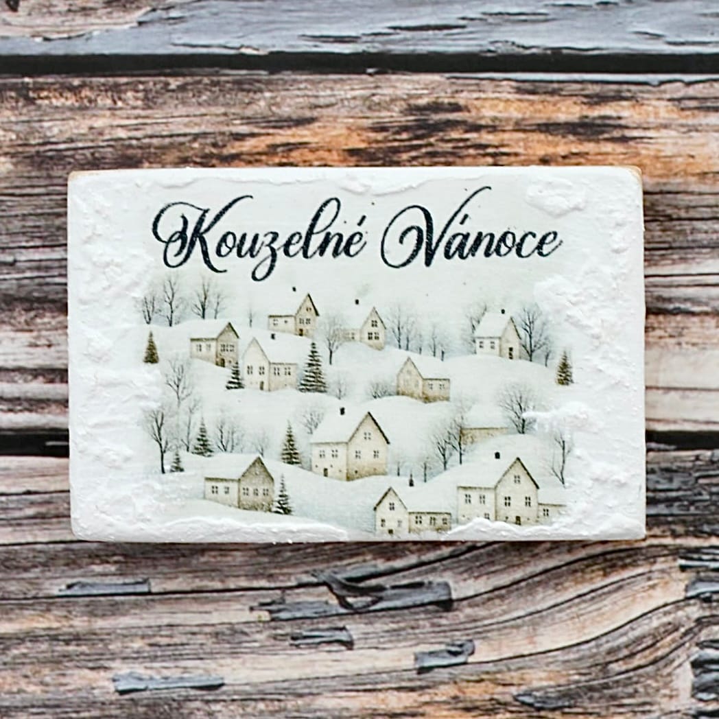 Dřevená zasněžená cedulka se zimním motivem vesničky a nápisem ” kouzelné Vánoce”.