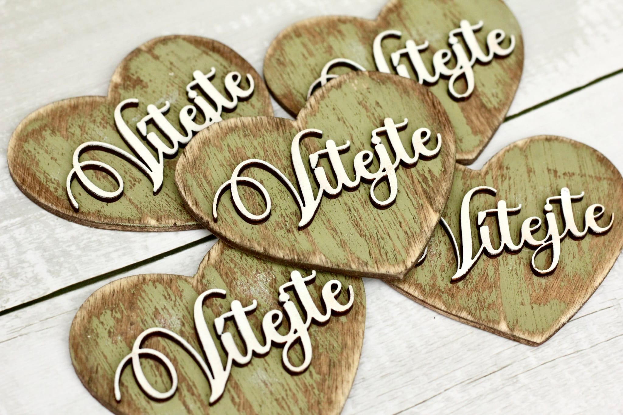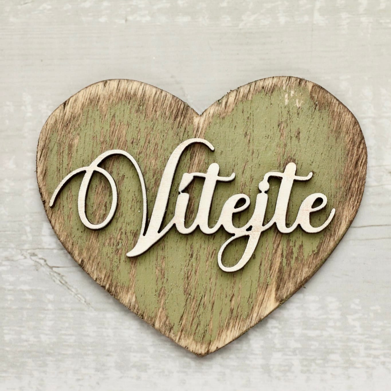 Krásné dřevěné srdíčko v zelené barvě s patinou . Plastický vyřezávaný dřevěný nápis “Vítejte” uvnitř srdíčka  . Srdíčko je vhodné jako doplněk do věnečků a dalších dekorací , nebo i samostatně . Na přání je možnost i s navrtanou dírkou na pověšení – zadejte požadavek do poznámky k objednávce.