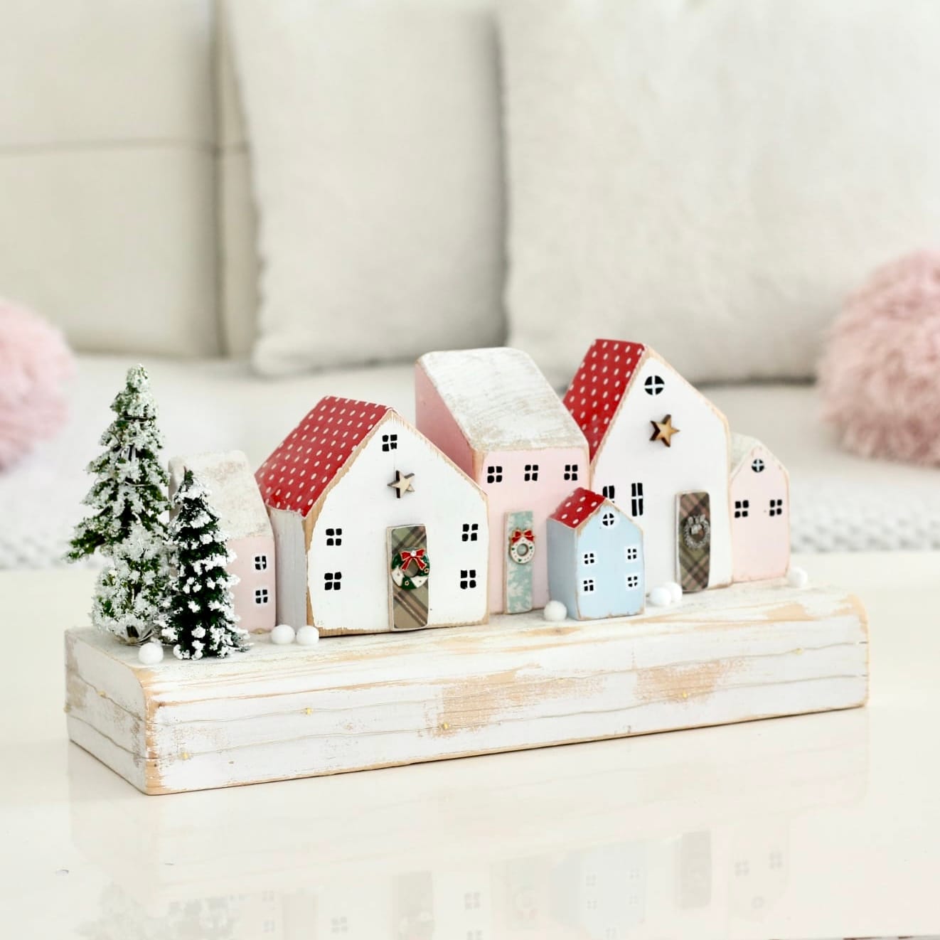 Vesnička je ručně vyrobená ze dřeva, jemně patinovaná a doplněná o drobné detaily – zdobené vchodové dveře, sněhem posypané střechy, drobné vánoční věnečky a zasněžené stromky.